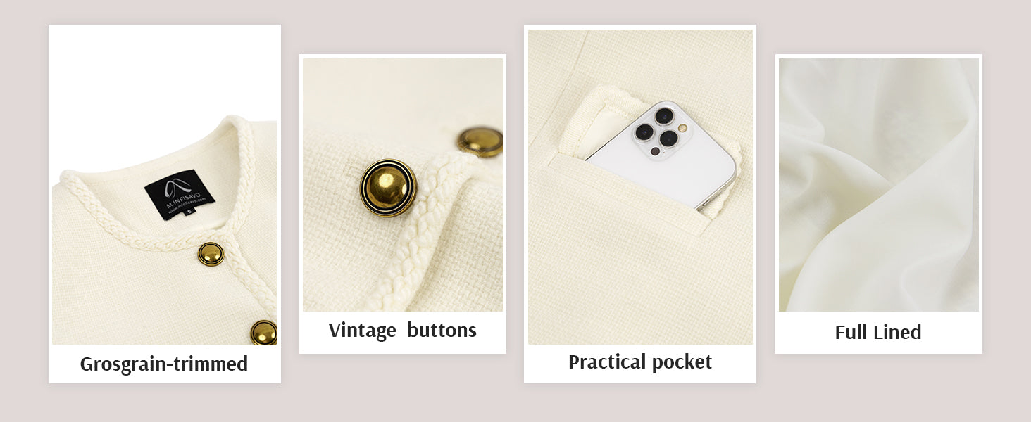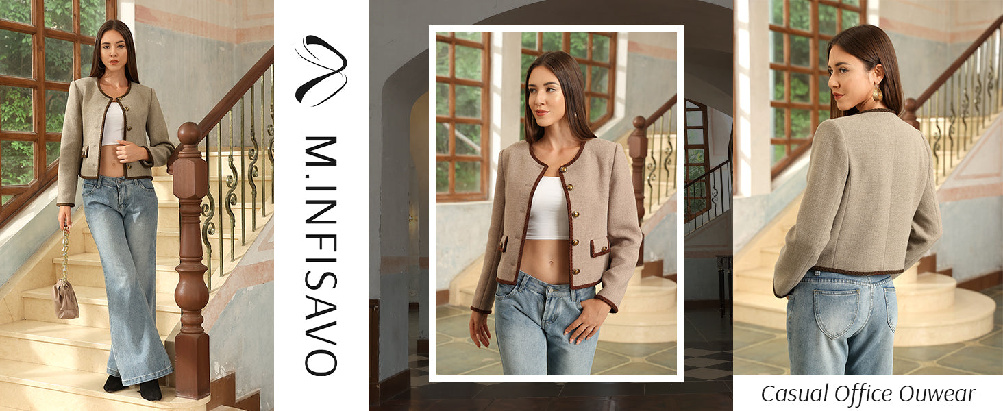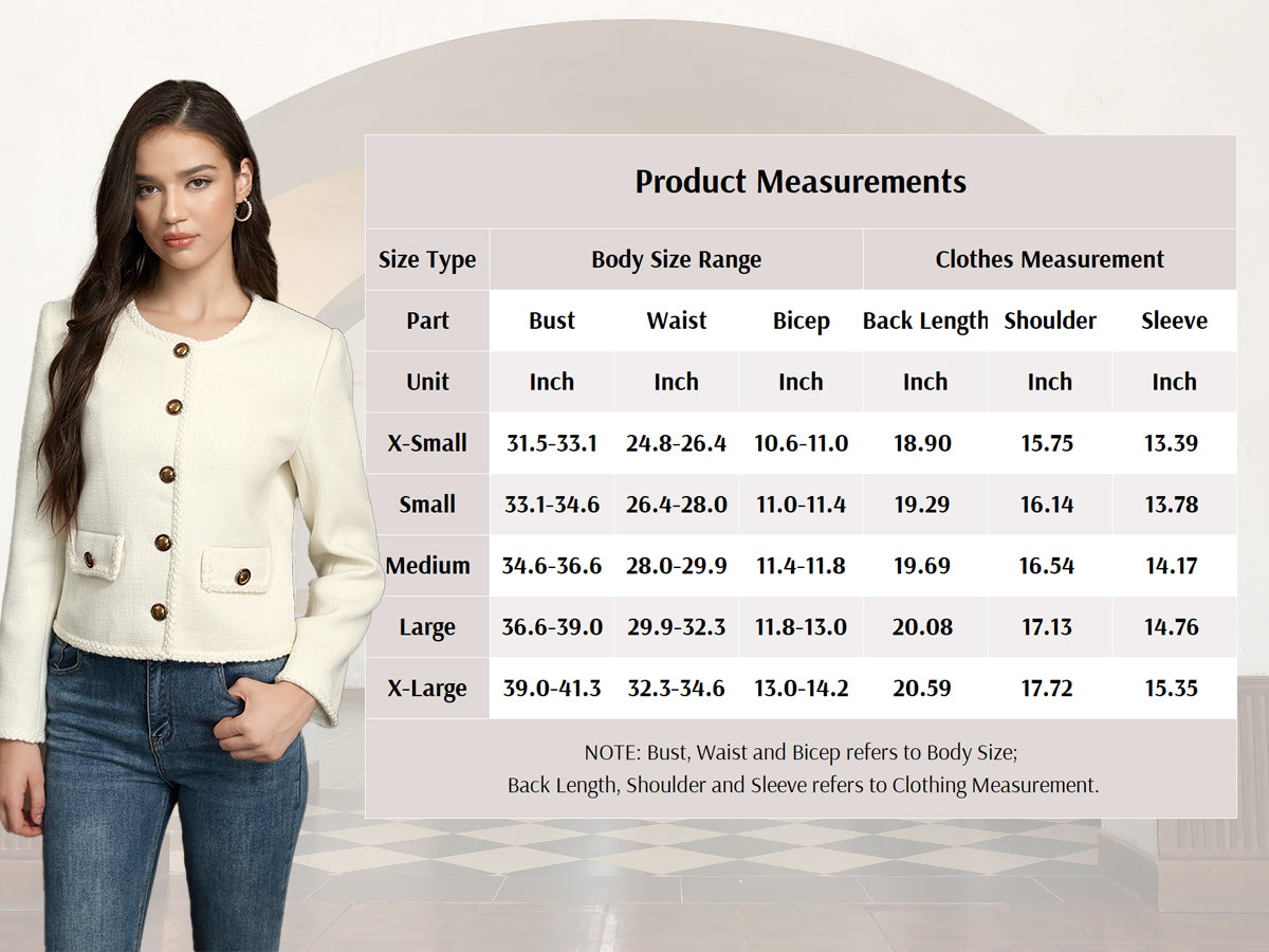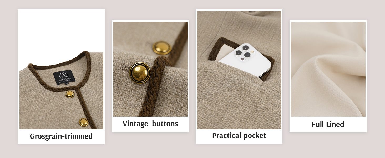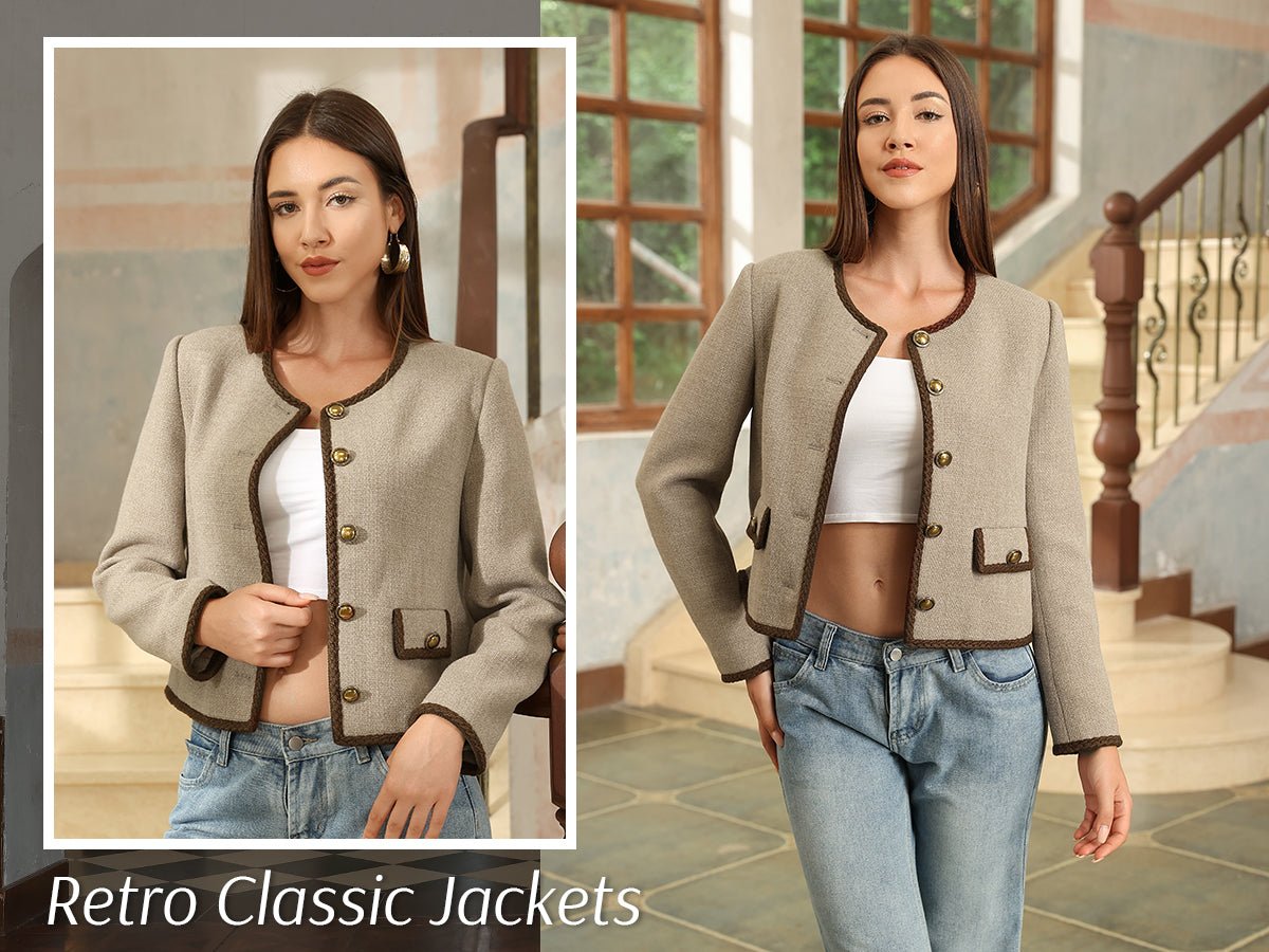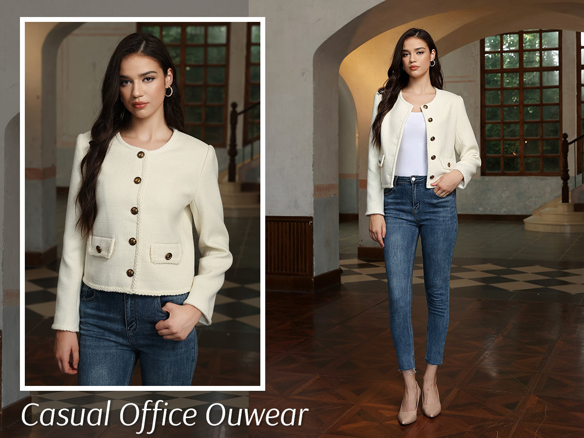 - Womens cropped jacket features with tweed fabric, turn down collared lapel, 2 functional pockets, long sleeve, vintage metal button closure, open front. 2025 classical fall shackets cardigan for petite, regular fit.