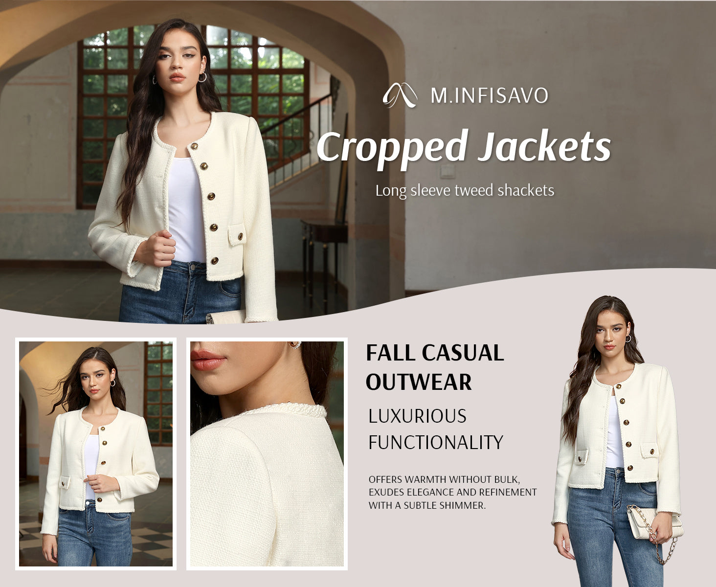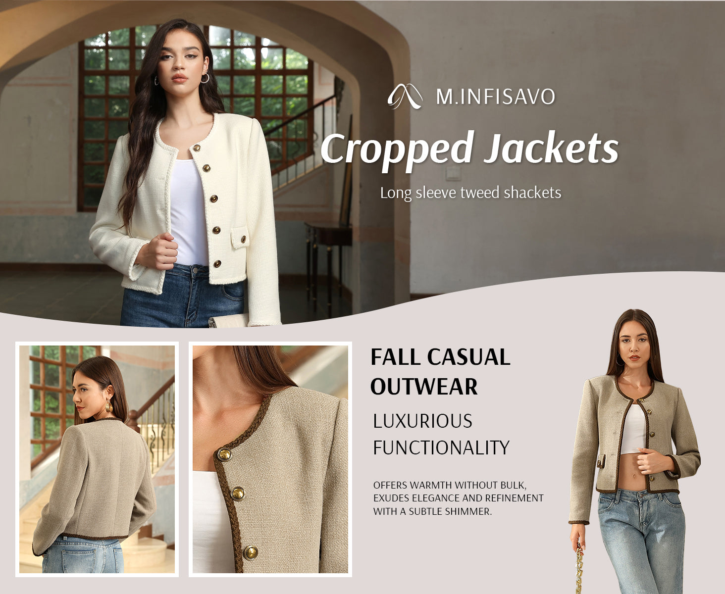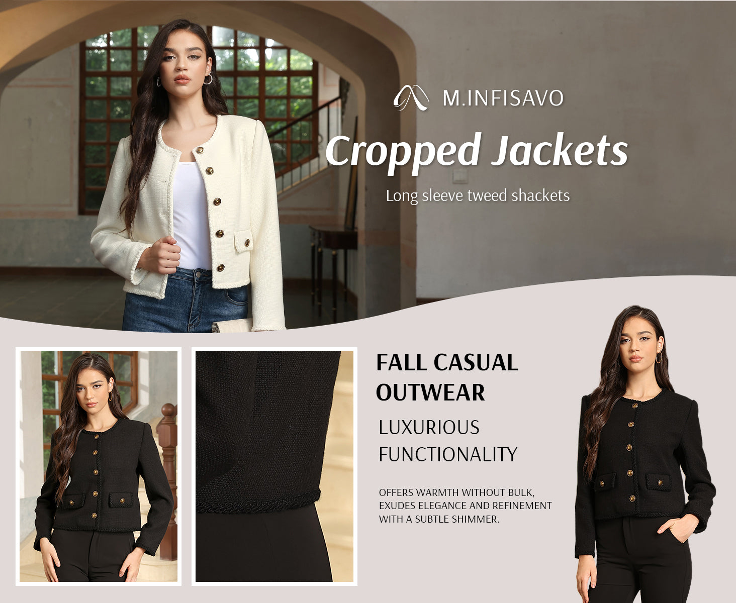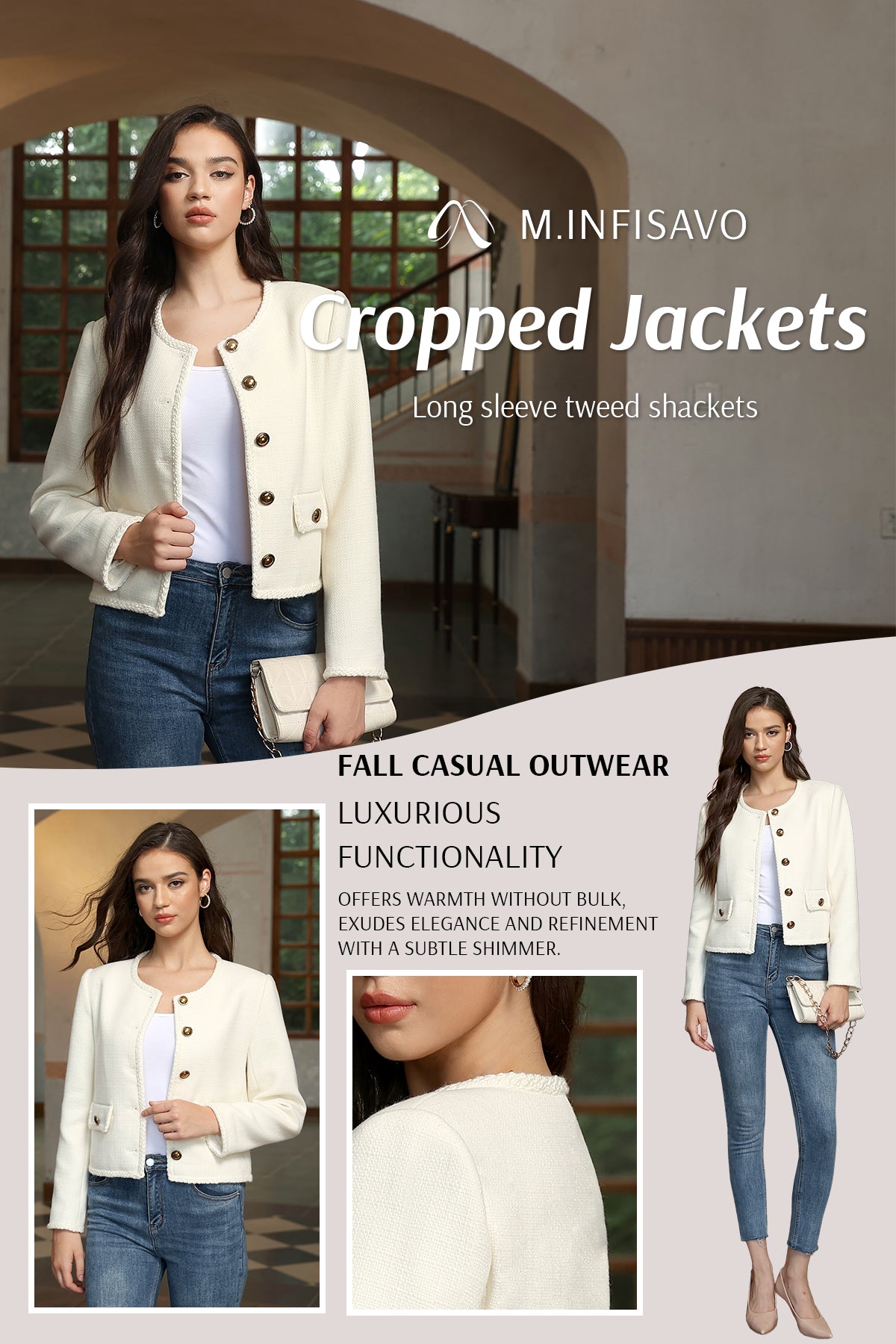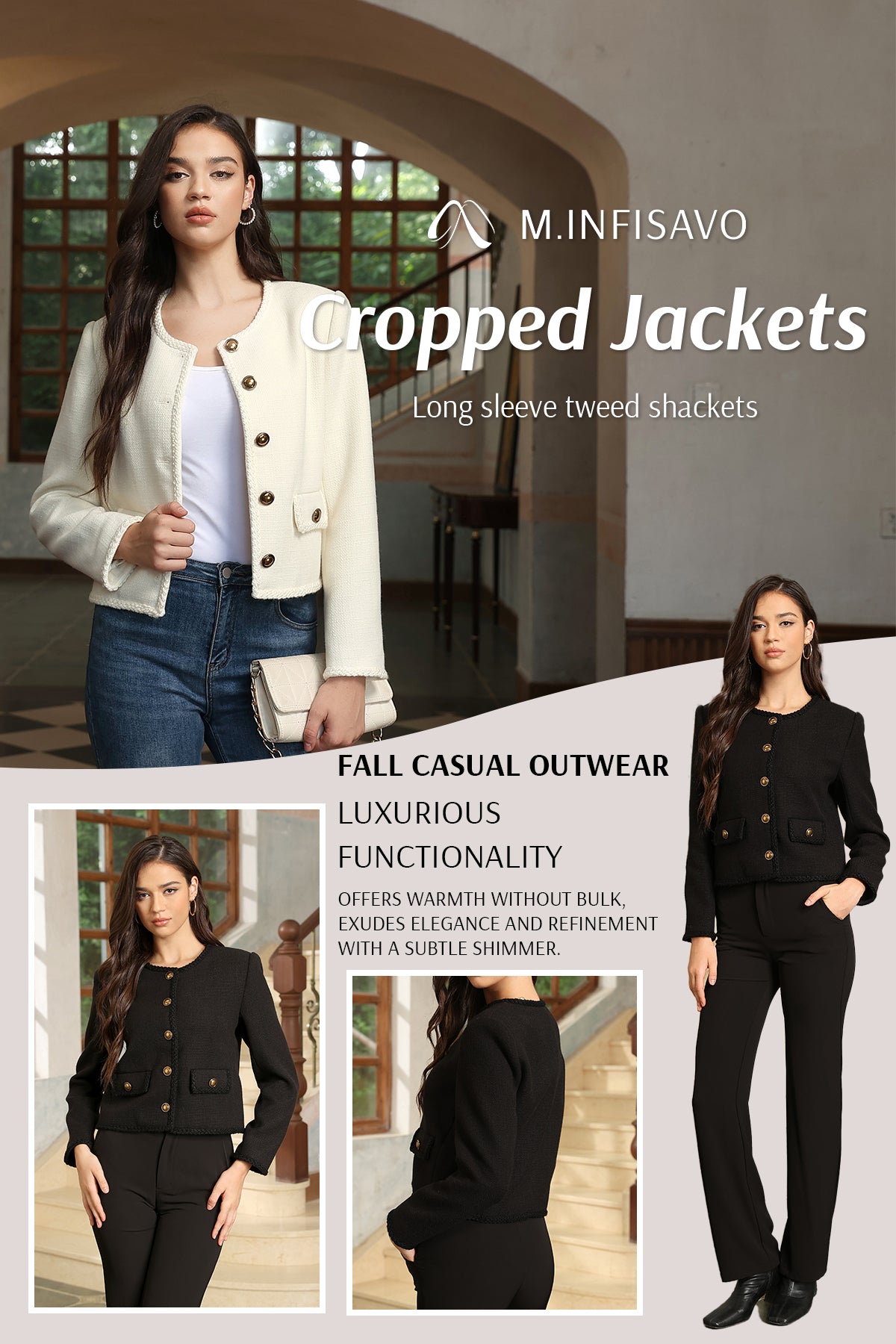 - Womens cropped jacket features with tweed fabric, turn down collared lapel, 2 functional pockets, long sleeve, vintage metal button closure, open front. 2025 classical fall shackets cardigan for petite, regular fit.